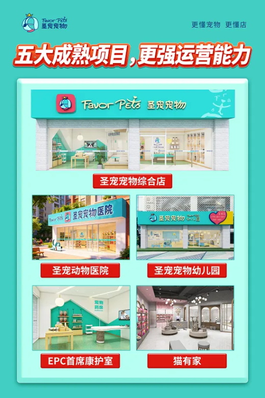 同时,为适应不同创业者的开店需求和市场趋势,圣宠宠物推出多元店型矩阵:“圣宠宠物综合店” “圣宠宠物诊所”“圣宠动物医院”“圣宠宠物幼儿园”,覆盖宠物行业热门赛道,满足消费者多样化选择,也让店铺拥有更广阔的发展潜力。